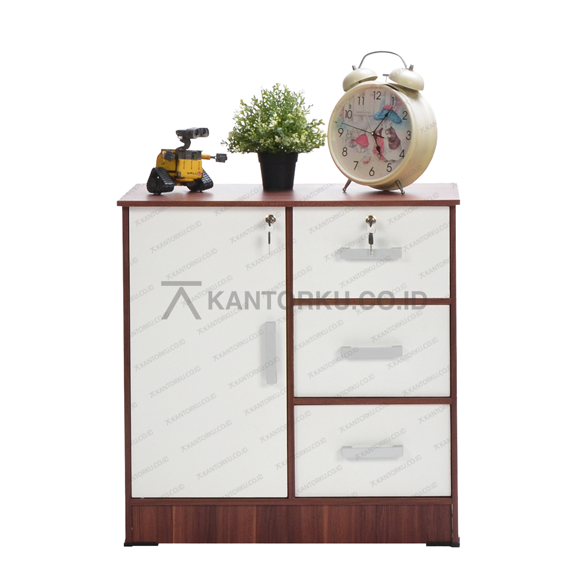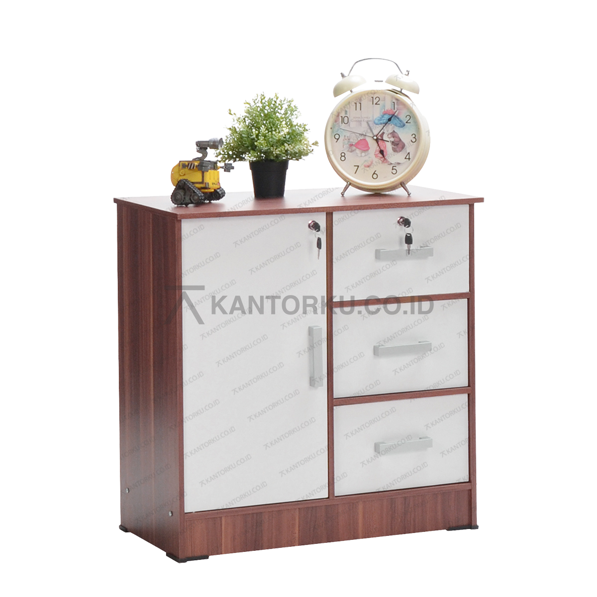- Fitur: 3 laci dan 1 pintu dengan kunci