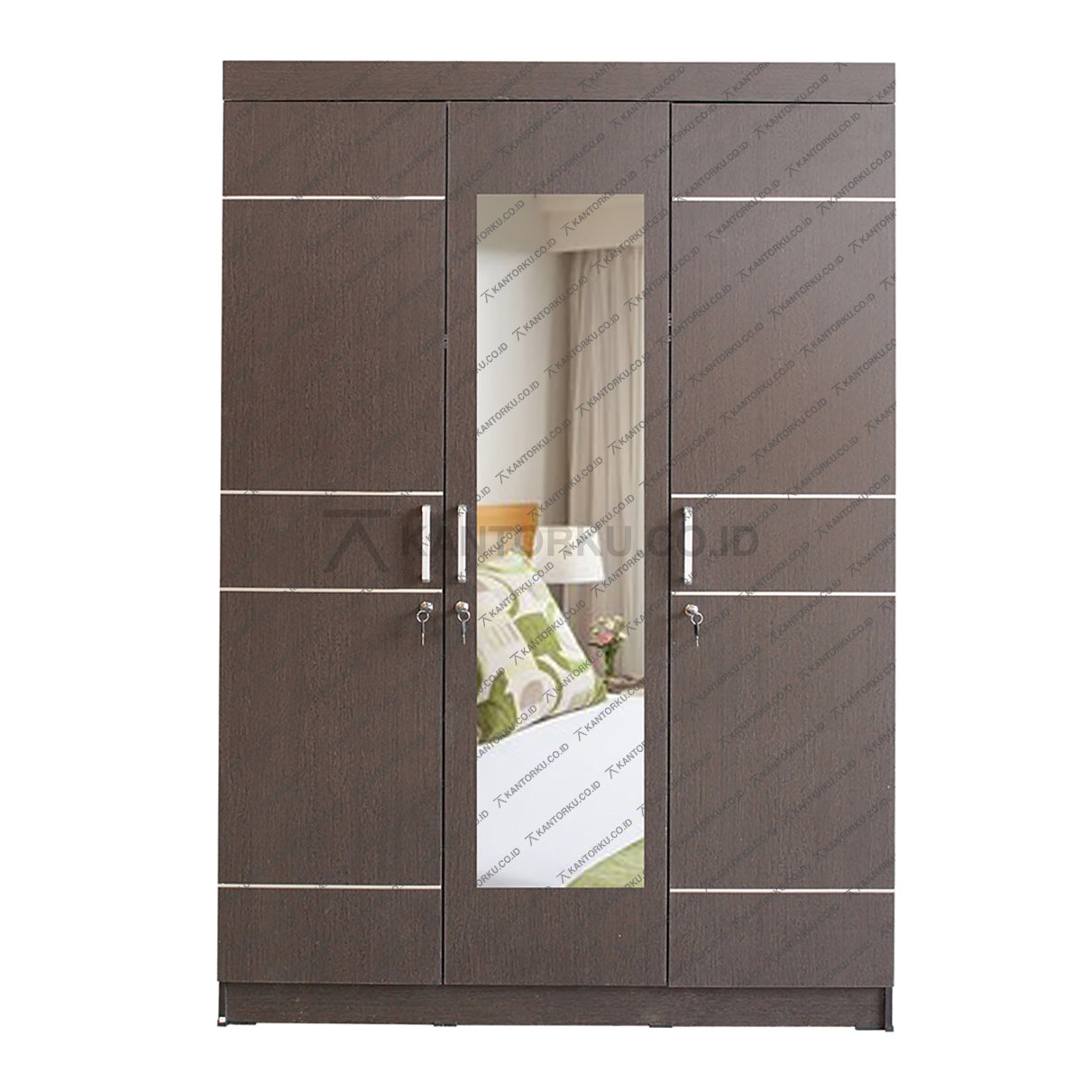 Lemari pakaian tiga pintu cermin hadir dengan warna espresso elegan yang dipadukan motif garis modern dan minimalis. Desainnya memberikan kesan mewah sekaligus tetap fungsional untuk melengkapi interior kamar Anda.
