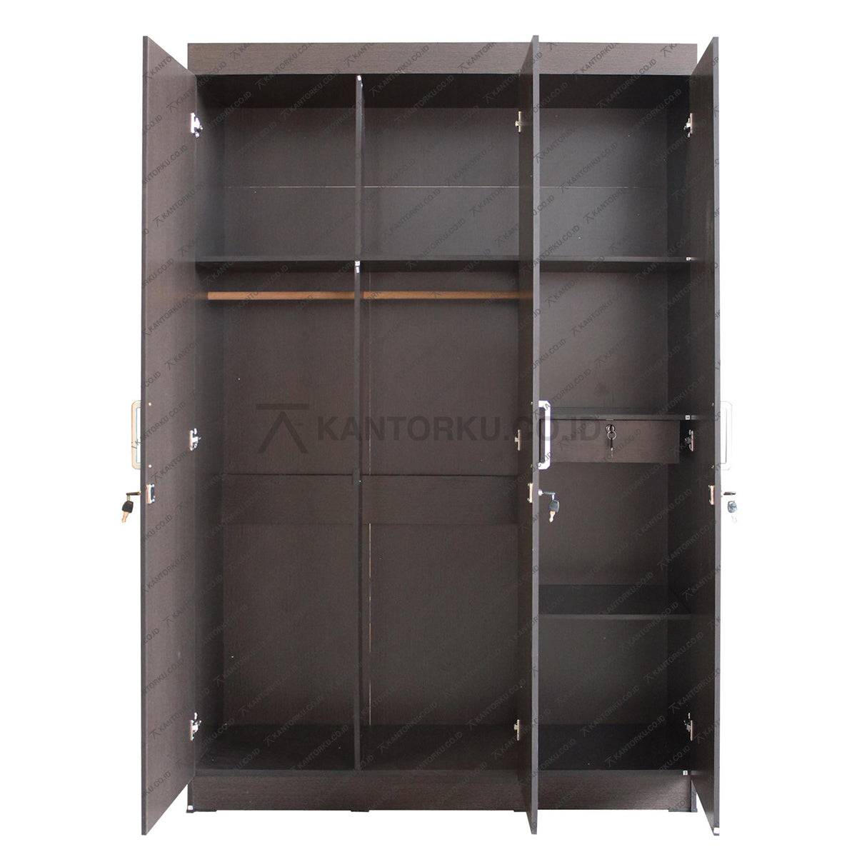 Bagian dalam lemari terdiri dari gantungan di sisi kiri serta rak-rak di sisi kanan yang rapi untuk menyimpan pakaian terlipat. Lemari pakaian tiga pintu tanpa cermin ini kini tersedia di KANTORKU. Dapatkan produk berkualitas untuk kebutuhan furnitur rumah Anda hanya di tempat kami.